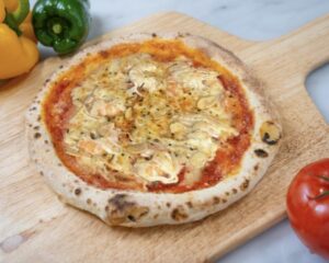 イタリアの漁師メシと言われるこのピザは、チーズを使わずに作りました。トマトソースにフライドガーリック、オレガノ、オリーブオイルを加えて、シンプルながらも風味豊かなピザに仕上げました。トマトの甘酸っぱさとオリーブオイルのコクが調和し、ニンニクとオレガノとバジルの香りが食欲を刺激します。